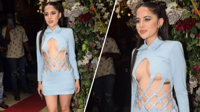 इसके साथ ही फ्रंट में चेस्ट के पास उल्टा वी शेप कटआउट में दिखाई दिया। इस मिनी ऑउटफिट के साथ उर्फी जावेद ने बालों को दो चोटियों में बांधा हुआ था। छोटे ब्लू ईयररिंग्स पहने थे। न्यूड मेकअप कर लुक को पूरा किया हुआ था।