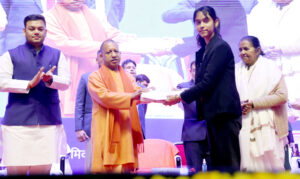 मुख्यमंत्री विद्यार्थियों को प्रधानमंत्री द्वारा लिखित ‘एग्जाम वाॅरियर्स’ पुस्तक तथा 08 मेधावी विद्यार्थियों को 01 लाख रु0 का चेक, टैबलेट तथा सम्मान पत्र प्रदान किया ‘द ब्लाट फाइल फोटो ‘